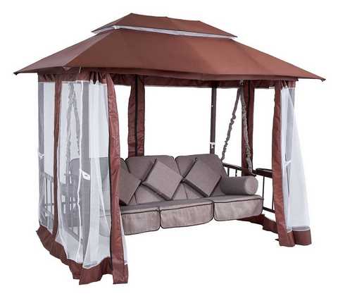 Мы хотим предложить вам приобрести комплект, предназначенный для садовых качелей-беседки Сакура. Данный комплект выполнен в шоколадном цвете, в него входит тент, а также противомоскитная сетка. В верхней части тента есть вентиляция. Данный комплект подойдёт для длины садовых качелей 285 см, ширины 200 см, высоты 250 см. Тент изготовлен из такой ткани, как Оксфорд 420.